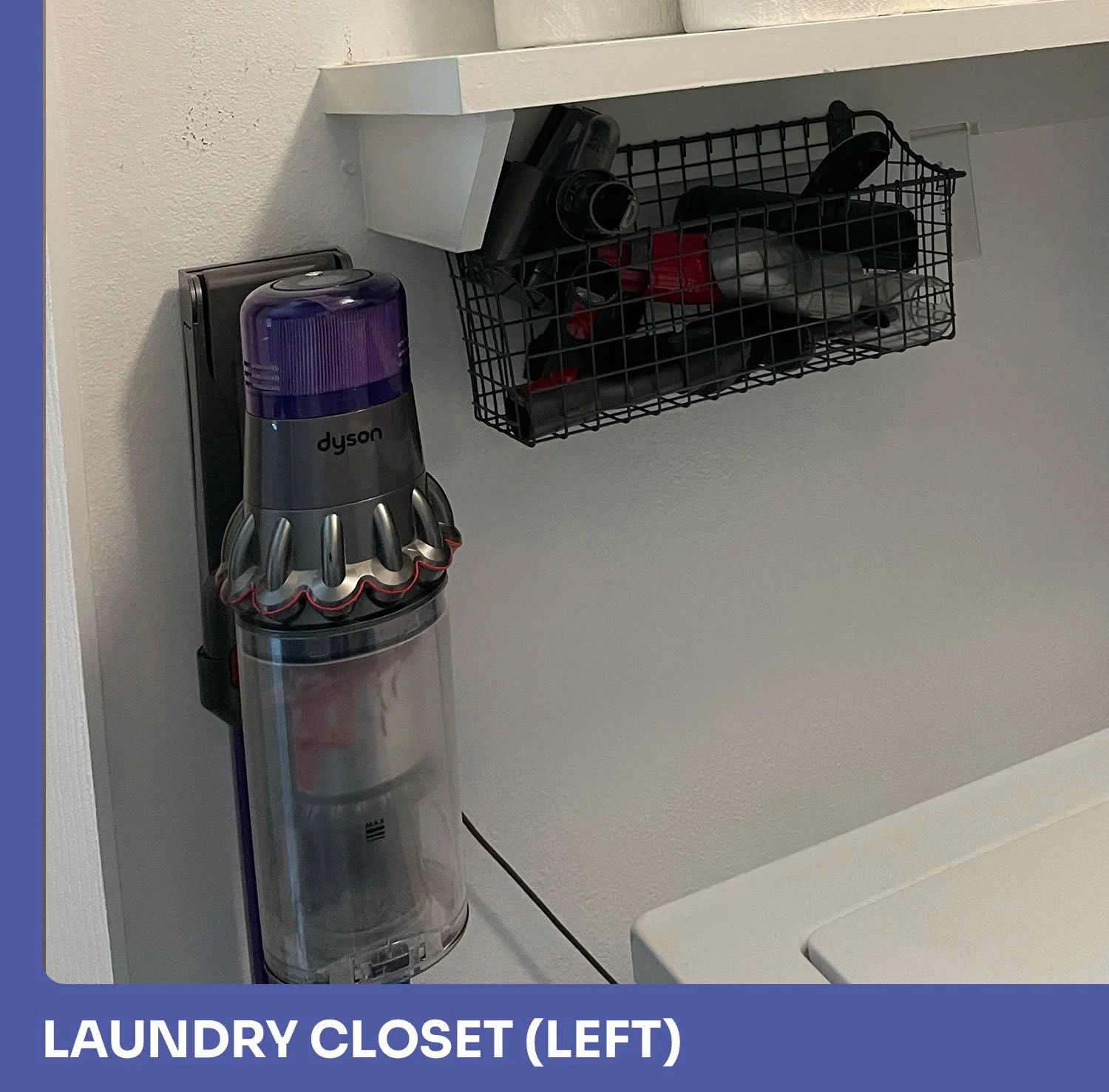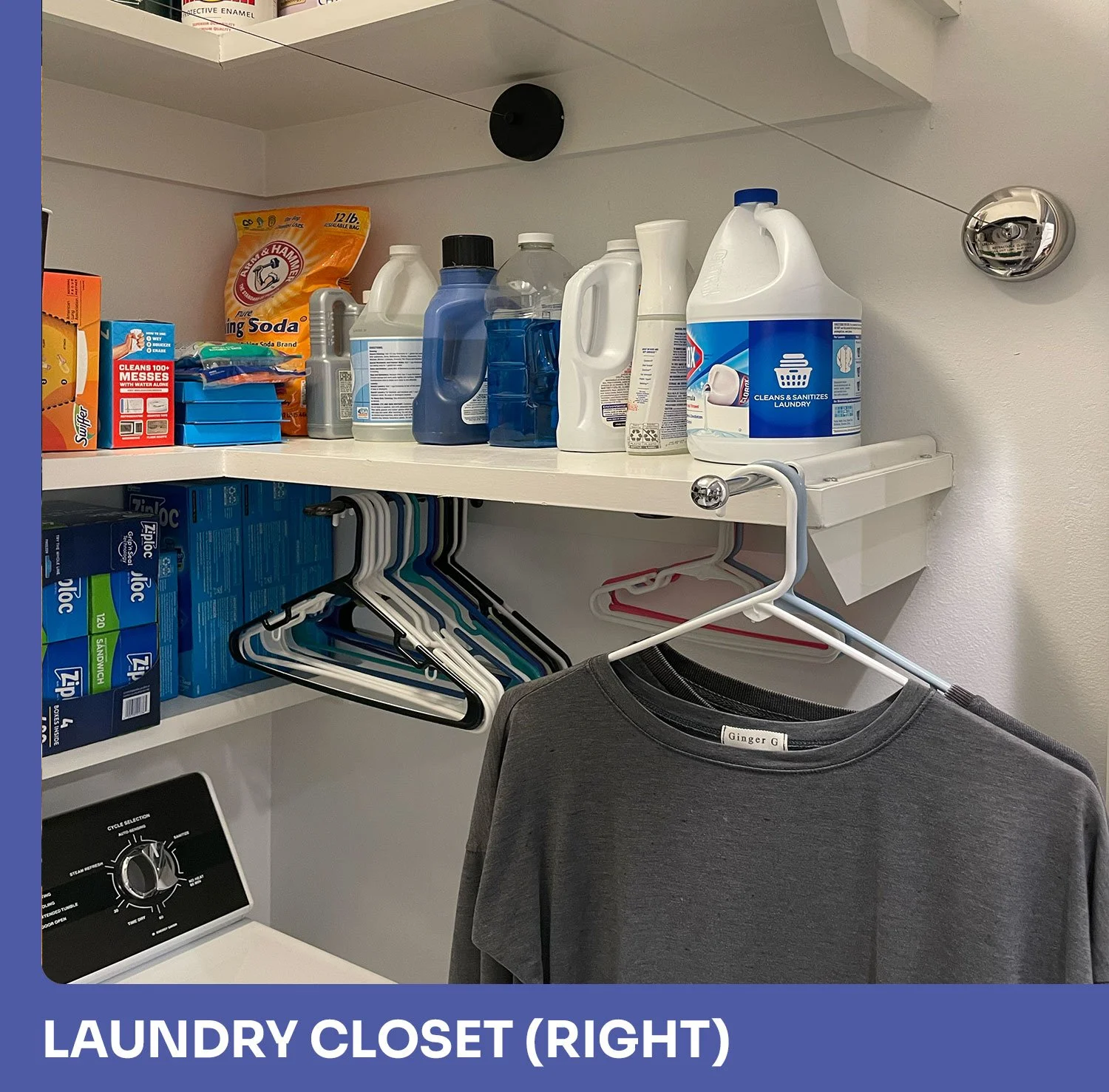 This small laundry closet is an excellent example of how adding a few small touches can drastically improve the functionality of a space that would otherwise be a jumbled mess. Along with serving the family’s laundry needs, this closet must store excess pantry items, cleaning supplies, extra wall paint for the entire house, some basic tools, and, of course, the ubiquitous bin of random wires. These items are easily stored in bins on the shelves. In addition to organizing items into bins, we added a few touches to improve functionality. On the left side, we hung their small vacuum on the wall along with a basket to keep the vacuum attachments contained. On the right side, we installed two retractable clothes lines for air drying, two rods to hold empty hangers, and a pullout rod for hanging up freshly dried laundry.