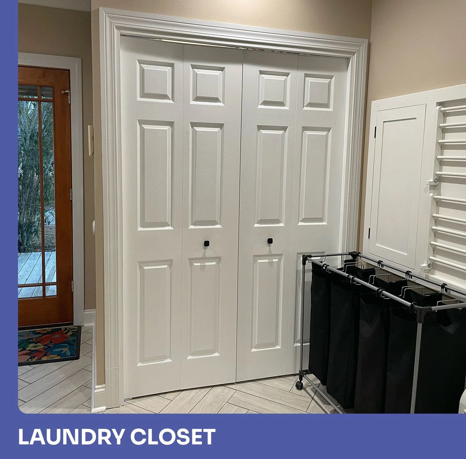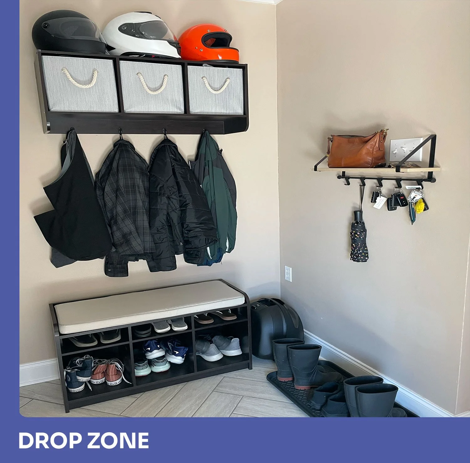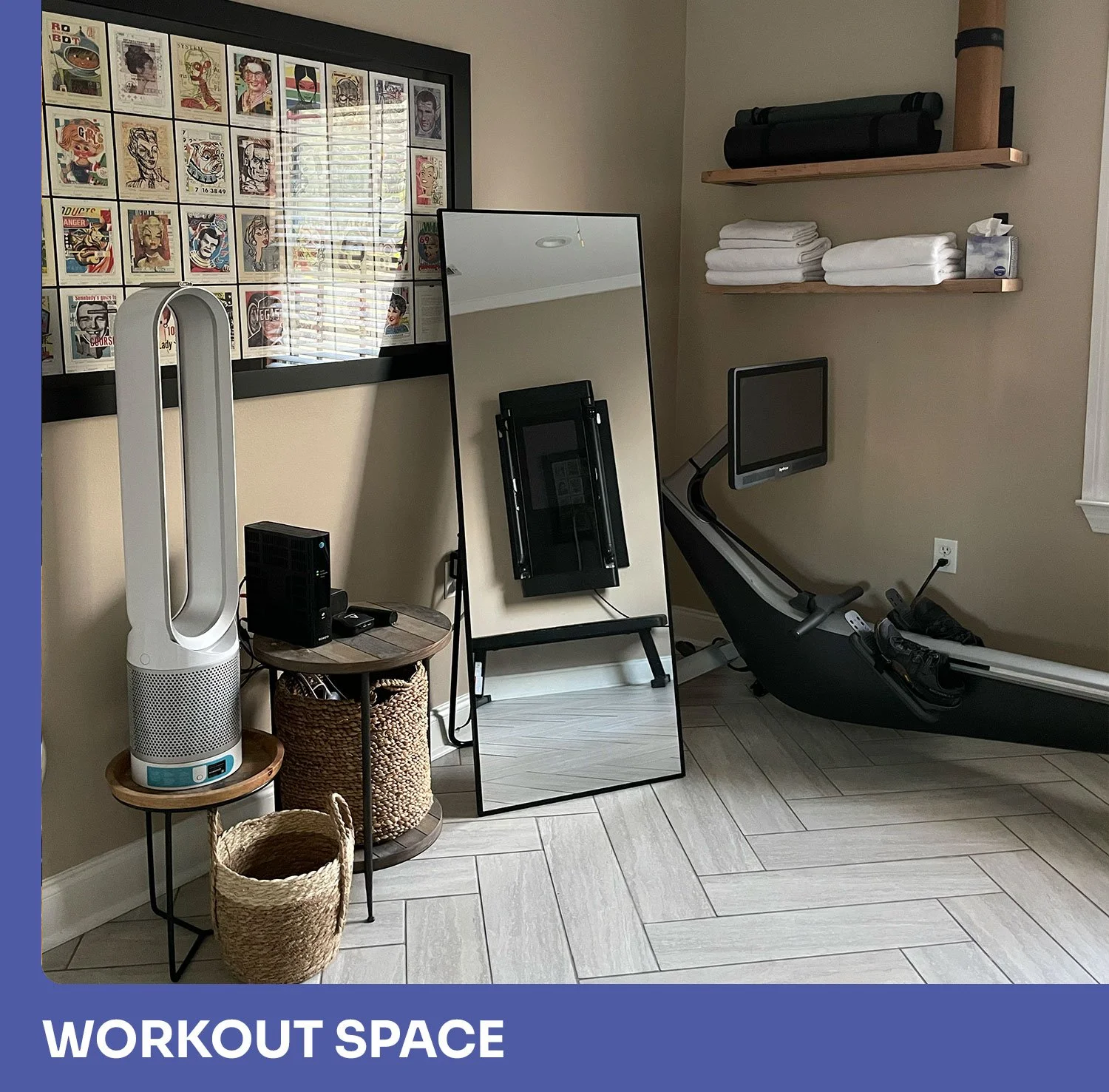 This space is a converted garage that needed to serve multiple purposes. A small laundry closet was added and a wall was built to allow for a drop zone at the backdoor. Outside of the laundry closet, we added a wall mounted cover for the electrical panel that includes space to hang delicates to air dry. The drop zone was designed to allow space for everything from muddy boots to motorcycle helmets to winter gear (in the bins). The majority of the converted garage is dedicated to a workout space. We tucked the row machine to one side, allowing space in the center of the room to use the Tonal hanging on the opposite wall. A mirror was placed to allow the user to see the Tonal even when facing away from the machine. Small tables hold a fan and other necessities, while baskets keep wires, etc., tucked out of the way.