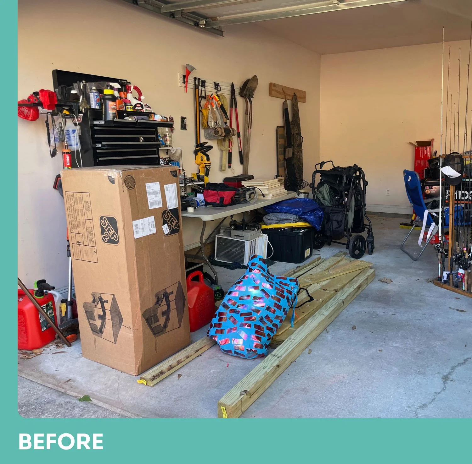 The goal of this project was to be able to park a car in the garage again. Unfortunately, I forgot to take before pictures! I did get some pictures after we had done a good bit of purging so that you can get an idea of what we were working with. After purging, we sorted items into categories and then organized each category, using bins and bin shelving purchased at Costco. We hung a couple of simple shelves using brackets and wood that the homeowner already had on hand and hung all of this yard tools within easy reach. The homeowner even let me sort his tools and put labels on his toolbox! Yay! And the car now comfortably fits in the garage with plenty of room to spare.